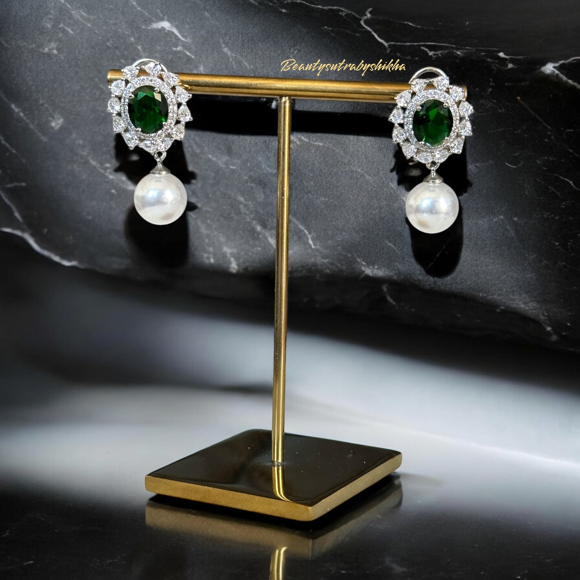 Elegant Emerald and CZ Diamond Earrings with Pearl Drop - Luxurious Jewelry