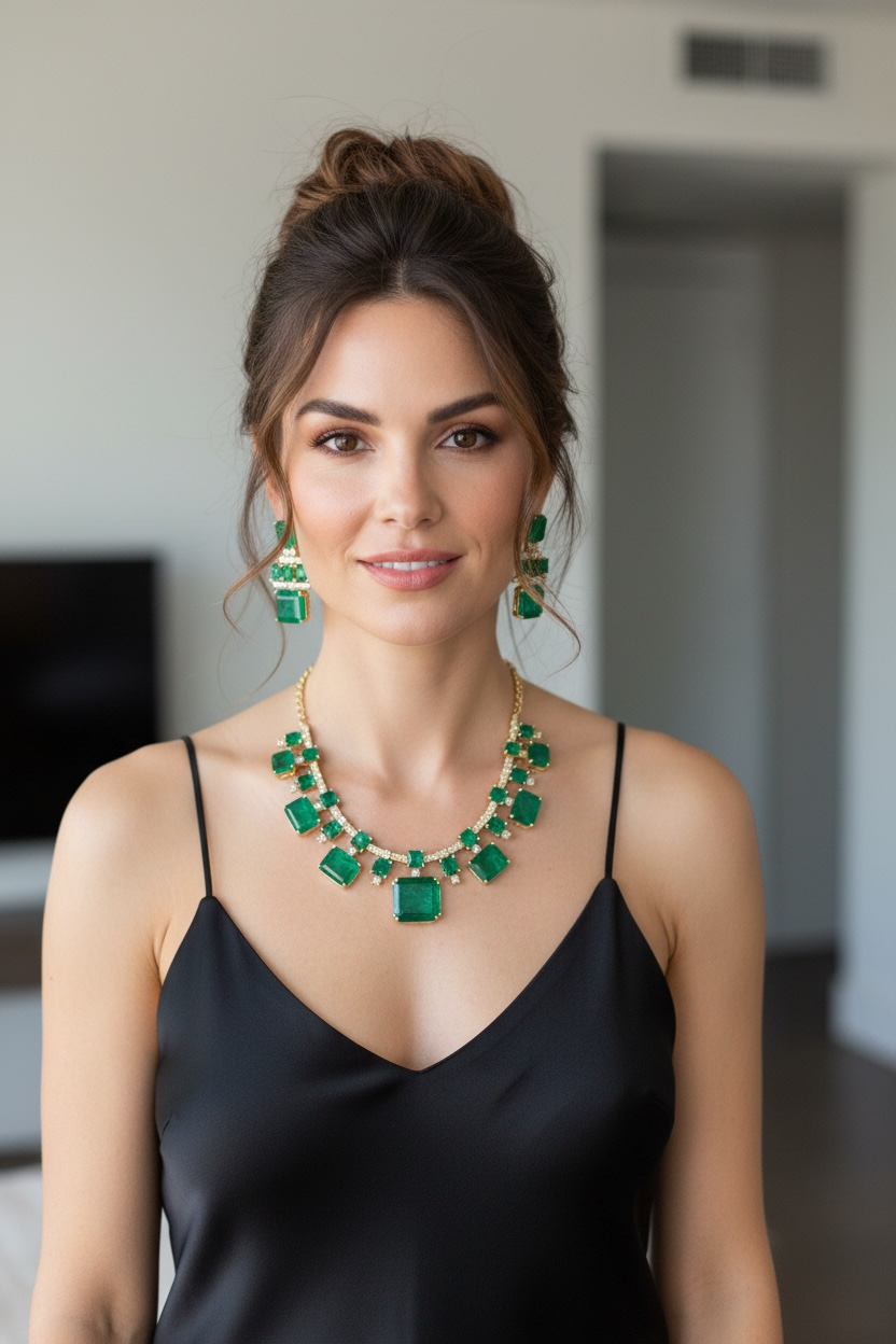 - Statement Necklace Design: Features a layered pattern of large and small emeralds with diamond bars, plus a bold center stone for a dramatic finish.