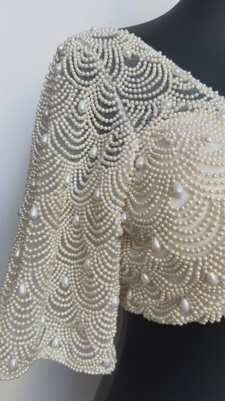 Elegant hand-embroidered pearl blouse with scallop design – perfect for brides, wedding guests, and festive events. Pair this luxurious ivory blouse with lehengas or sarees for a timeless statement. Ideal for Diwali, Navratri & reception looks.