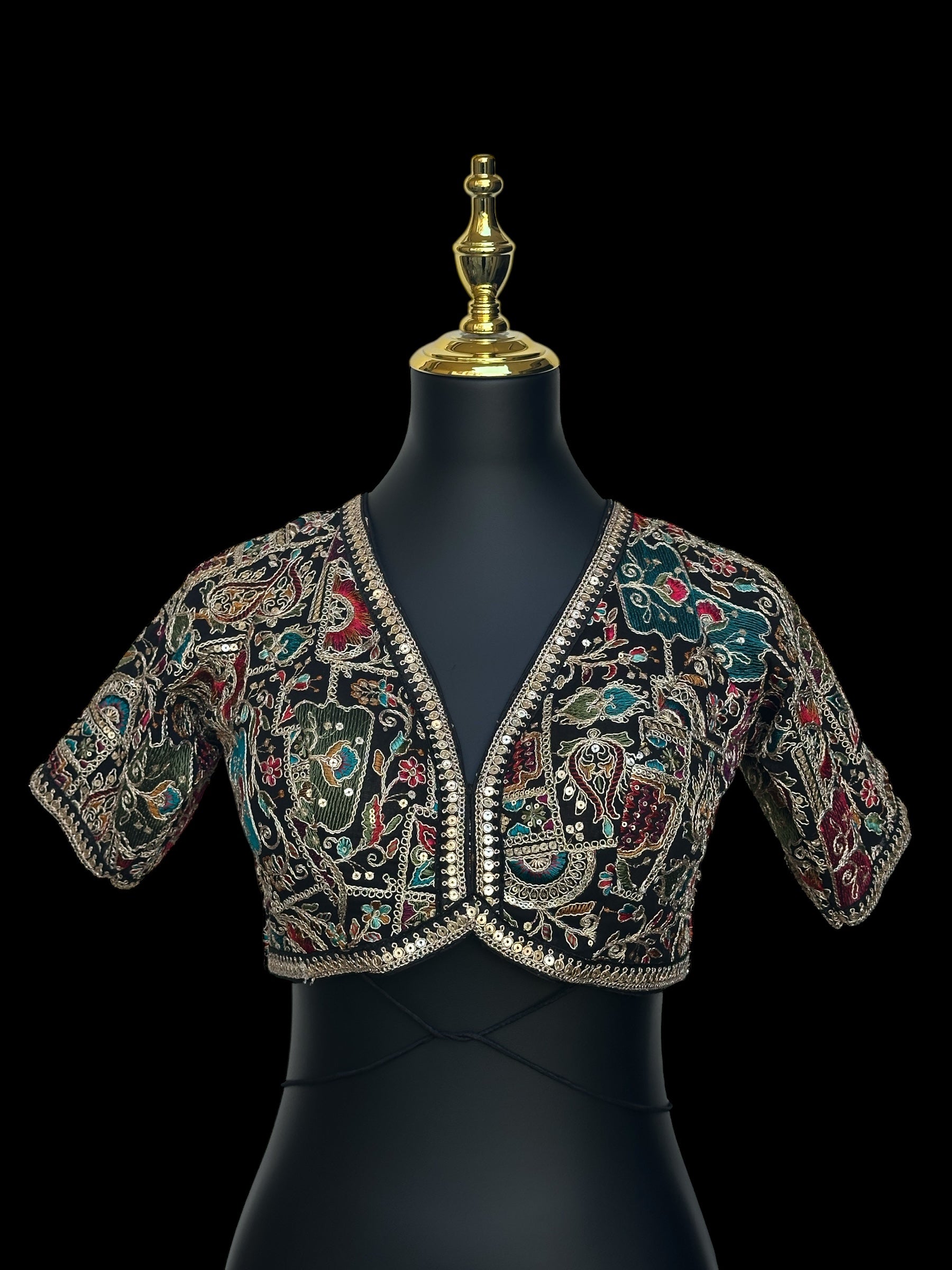 tunning handcrafted blouse with vibrant multicolor threadwork, mirror accents & paisley motifs on black base. A perfect match for lehengas or skirts during Navratri, Garba nights, Diwali parties & Mehendi functions. Traditional yet statement-worthy.