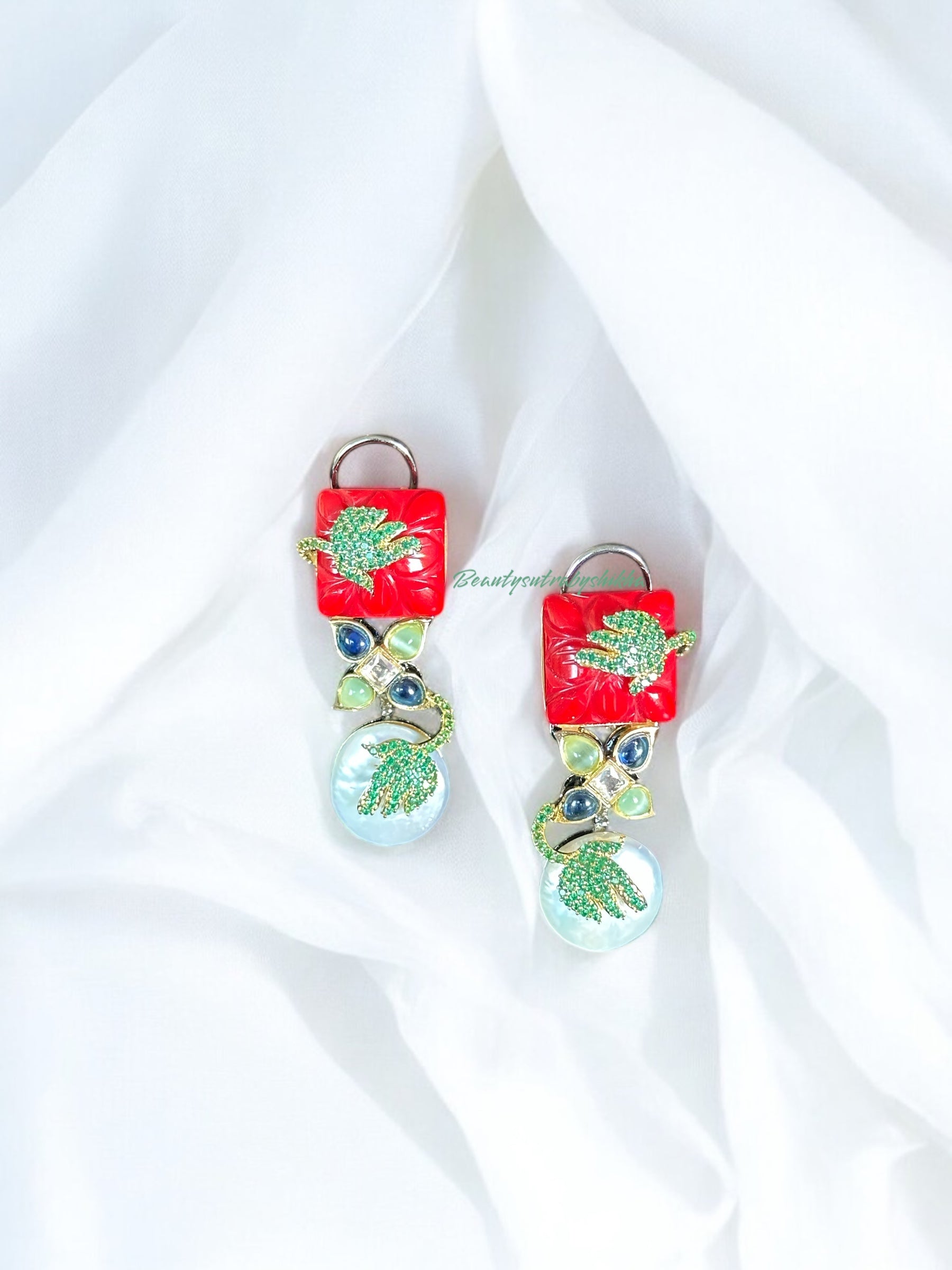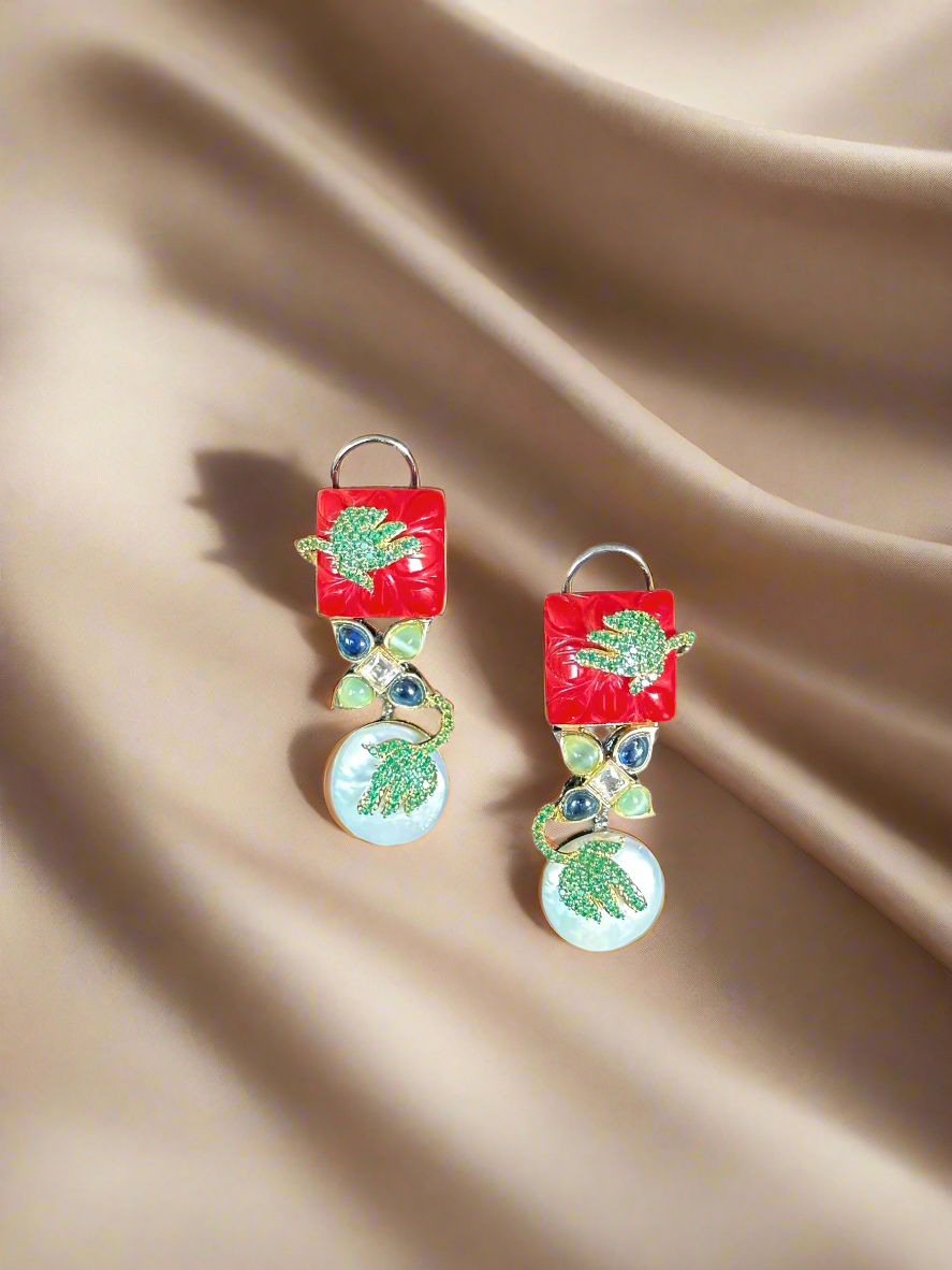 Add a touch of artistic charm to your ensemble with these exquisite red and pearl drop earrings. Featuring bold red enamel tops adorned with green leaf detailing, gemstone accents, and elegant pearl drops, these earrings make a unique statement for festive occasions, weddings, or evening wear. Handcrafted for the modern woman who loves tradition with a twist.